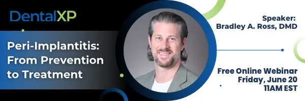 Don't miss an exclusive opportunity to elevate your dental expertise with DentalXP's FREE online webinar, 'Peri-Implantitis: From Prevention to Treatment,' hosted by the esteemed Dr. Bradley A. Ross, DMD. This engaging session will take place on Friday, June 20, at 11:00 AM EST. Don't miss out on the chance to deepen your understanding and enhance your skills in managing peri-implantitis—register now to secure your spot and be part of